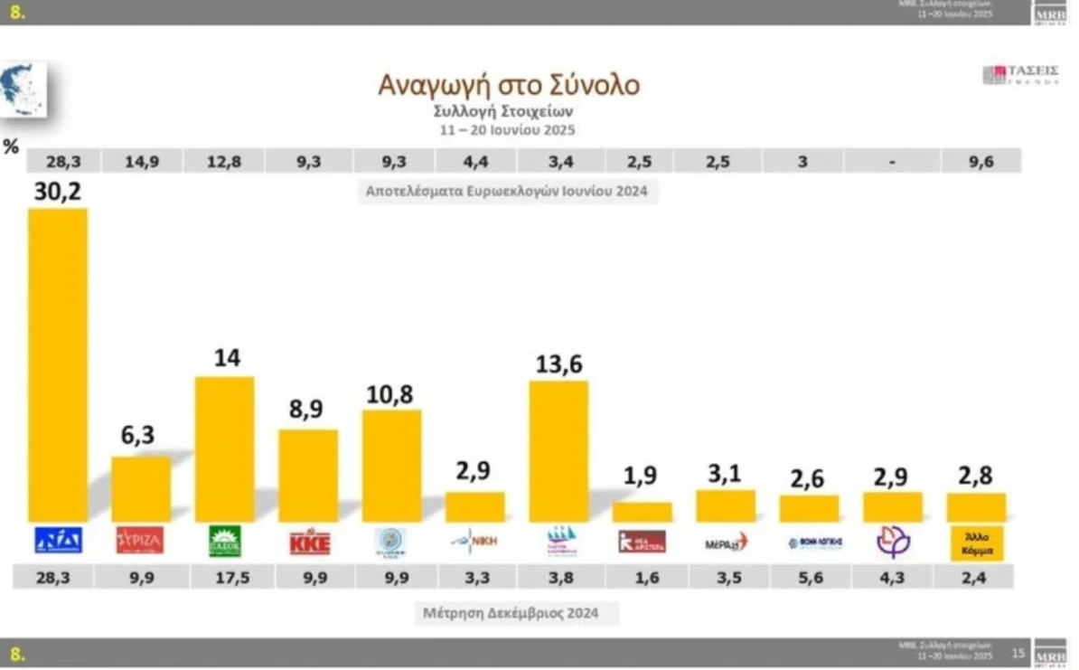 Tην συνεχιζόμενη άνοδο της ΝΔ, όπως και την πτώση των ποσοστών της Πλεύσης Ελευθερίας που είναι πλέον στην τρίτη θέση, πίσω από το ΠΑΣΟΚ, που επίσης καταγράφει ανοδική πορεία, επιβεβαιώνει η έρευνα «Τάσεις» της MRΒ.