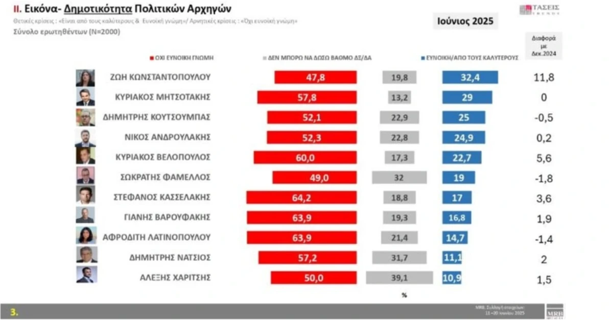 Συγκεκριμένα, η ΝΔ έχει 23,7% στην πρόθεση ψήφου από 22,7% στα τέλη Μαΐου, το ΠΑΣΟΚ ανεβαίνει στο 11% και η Πλεύση πέφτει στο 10,7%, με αποτέλεσμα στην αναγωγή επί των εγκύρων, το κυβερνών κόμμα να εμφανίζεται στο 30,2%, δηλαδή 2,1 μονάδες πάνω από το ποσοστό των ευρωεκλογών, το ΠΑΣΟΚ στο 14% - με άνοδο 1,2 μονάδων - ενώ το κόμμα της Ζωής Κωνσταντοπούλου μέσα σε λιγότερο από έναν μήνα πέφτει από το 15,6% στο 13,6%.