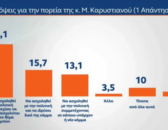 Σε άλλη ερώτηση, το 51,1% θεωρεί ότι δεν πρέπει να ασχοληθεί με την πολιτική και να συνεχίσει να αγωνίζεται μόνο με το θέμα των Τεμπών, ενώ το 15,7% λέει να «ασχοληθεί με την πολιτική και να ιδρύσει δικό της κόμμα». Ακόμα, το 56,7% των ερωτηθέντων απαντά πως μάλλον ή σίγουρα δεν θα ψήφιζε πιθανό κόμμα με αρχηγό τη Μαρία Καρυστιανού, ενώ το 32,2% απαντά «σίγουρα» ή «μάλλον» θα το ψήφιζε.
