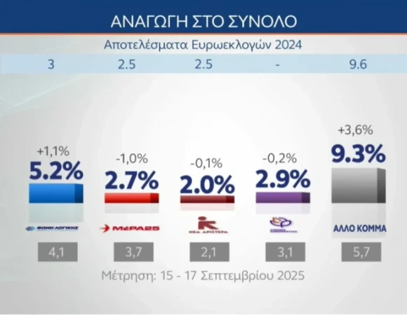 Στην αναγωγή στο σύνολο, η ΝΔ συγκεντρώνει 28% κινούμενη στα ποσοστά των ευρωεκλογών και ακολουθούν το ΠΑΣΟΚ με 13,8%, η Ελληνική Λύση με 12,1%, η Πλεύση Ελευθερίας με 9,4%, το ΚΚΕ με 8,6%, ο ΣΥΡΙΖΑ, η Φωνή Λογικής 5,2% με 4,3%, Κίνημα Δημοκρατίας 2,9%, Μέρα25 2,7%, Νέα Αριστερά 2% και η Νίκη με 1,7%. Παρατηρείται θεματική αύξηση 3,6% στην απάντηση «άλλο κόμμα».