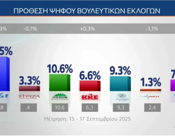 Ίδια εικόνα καταγράφεται και στην πρόθεση ψήφου με τη διαφορά μεταξύ ΝΔ και ΠΑΣΟΚ να μειώνεται στο 10,9%.