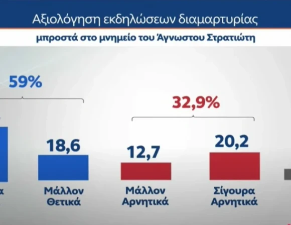 Πρέπει να γίνονται εκδηλώσεις διαμαρτυρίας μπροστά στο μνημείο του Άγνωστου Στρατιώτη; Το 59% απαντά σίγουρα θετικά ή μάλλον θετικά, ενώ το 32,9% σίγουρα αρνητικά ή μάλλον αρνητικά. Δηλαδή, έξι στους 10 τάσσεται υπέρ των εκδηλώσεων διαμαρτυρίας μπροστά στο μνημείο.