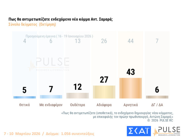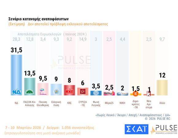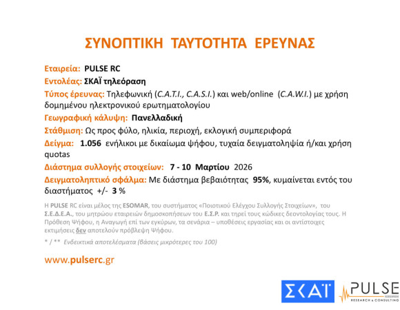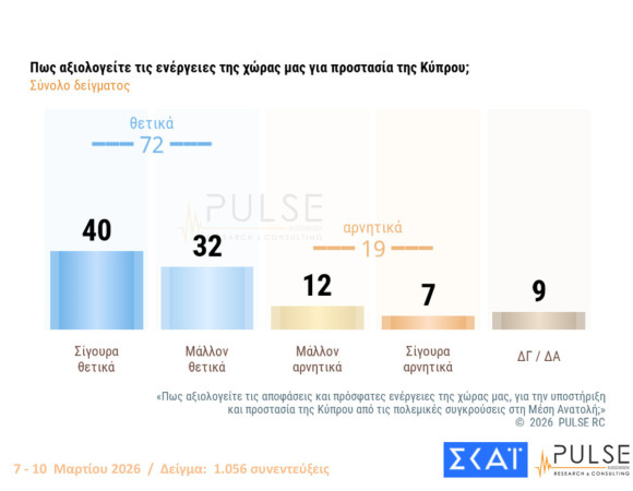 Μιάμιση μονάδα στην πρόθεση ψήφου και δύο στην εκτίμηση (ψήφου) κερδίζει η Νέα Δημοκρατία στη δημοσκόπηση της Pulse που παρουσιάστηκε στο κεντρικό δελτίο του Σκάι, καθώς καταγράφεται ως διακομματική η αποδοχή των κινήσεων της κυβέρνησης σε σχέση με την προστασία της Κύπρου με τις φρεγάτες και τα F-16, που οδήγησε στη συμμετοχή αρκετών ευρωπαϊκών κρατών στην επιχείρηση.
