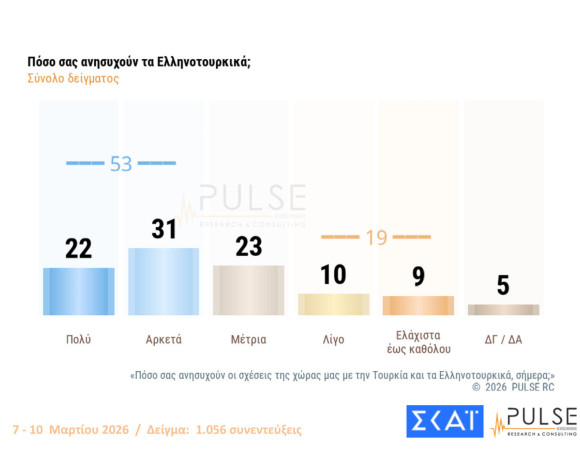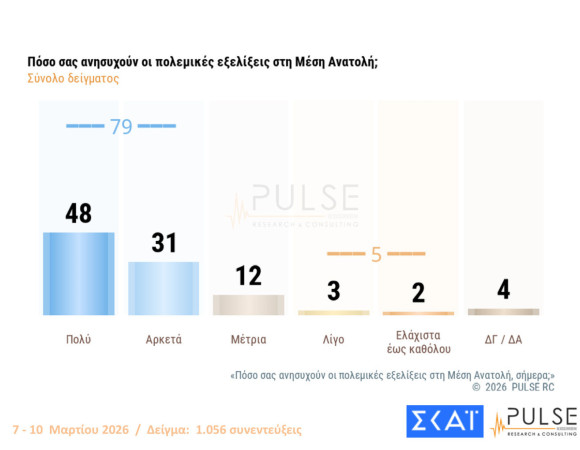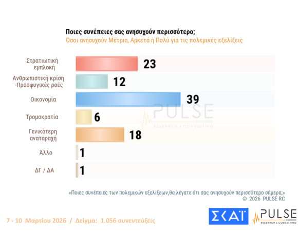 Το θερμόμετρο της ανησυχίας των πολιτών «έγραψε» 79% για τις εξελίξεις στη Μέση Ανατολή. Οι πολίτες δηλώνουν ότι ανησυχούν πρωτίστως για την οικονομία (39%), αλλά και για το ενδεχόμενο στρατιωτικής εμπλοκής(23%), ενώ υπάρχει και ένα 12% ανησυχεί για το ενδεχόμενο ανθρωπιστικής κρίσης και έντασης των προσφυγικών ροών.