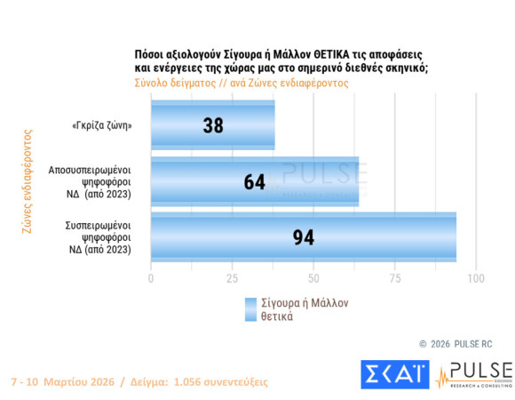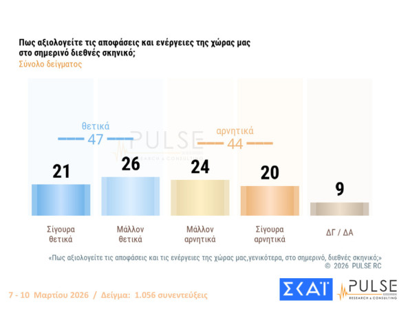 Πολύ υψηλή είναι η αποδοχή των ελληνικών αποφάσεων και κινήσεων στο σημερινό διεθνές σκηνικό - η ερώτηση αφορά το σύνολο της εξωτερικής πολιτικής: Το 47% απαντά σίγουρα ή μάλλον θετικά, με τις θετικές γνώμες να φτάνουν στο 38% μεταξύ των ψηφοφόρων της «γκρίζας ζώνης», στο 64% μεταξύ των «αποσυσπειρωμένων» ψηφοφόρων της ΝΔ των εκλογών του 2023 και στο 94% μεταξύ των σημερινών ψηφοφόρων της.