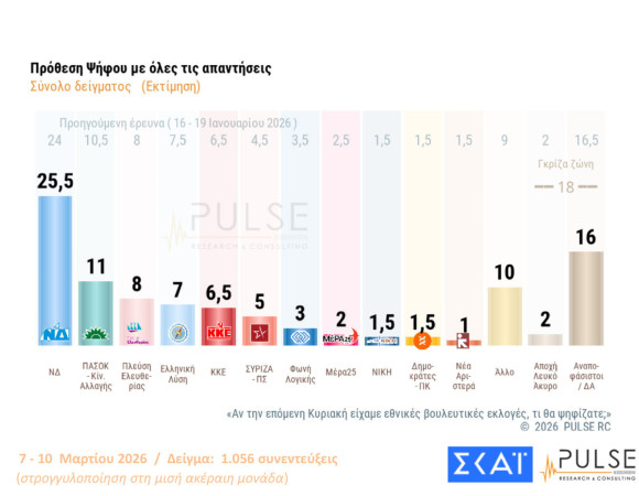 Το κυβερνών κόμμα φτάνει στο 31,5% στην εκτίμηση ψήφου (από 29,5% τον Ιανουάριο) και ανεβάζει τη διαφορά με το ΠΑΣΟΚ από τις 16,5 μονάδες στις 18. Η αξιωματική αντιπολίτευση εμφανίζει επίσης μικρά κέρδη μισής μονάδας και δείχνει να παγιώνεται στην δεύτερη θέση με διαφορά 4 μονάδων από την Πλεύση Ελευθερίας, που μένει σταθερή στο 9,5% στην εκτίμηση ψήφου, με προβάδισμα μισής μονάδας από την Ελληνική Λύση, που έχει οριακές απώλειες (-0,5 στην πρόθεση ψήφου).