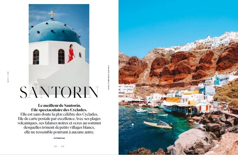 Το 6σέλιδο αφιέρωμα με τίτλο «Τα καλύτερα της Σαντορίνης - Το εντυπωσιακό νησί των Κυκλάδων» παρουσιάζει όλες τις πτυχές πολυτελείας, ευεξίας και ευ ζην που προσφέρει το νησί, αλλά και την εξαιρετική γαστρονομία με τη μοναδική ποικιλία των κρασιών της, που την καθιστούν γη γεύσεων για το γαλλικό κοινό.