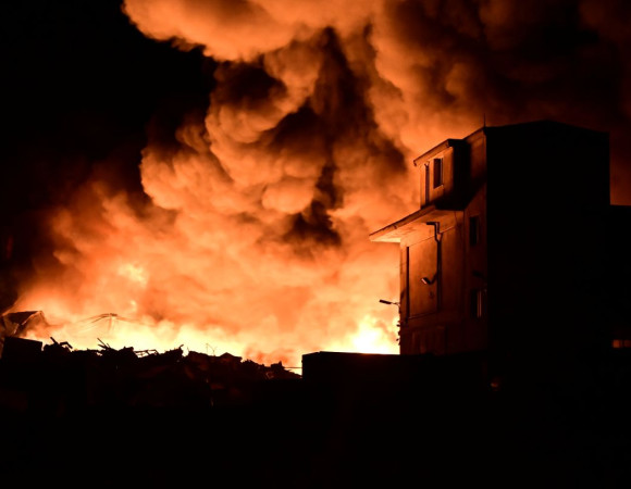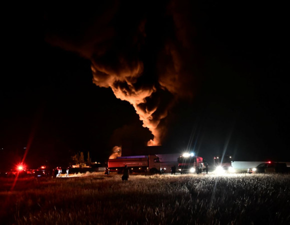 Συνεχίζεται η κατάσβεση της πυρκαγιάς που ξέσπασε γύρω στις 20.30 σήμερα, Δευτέρα, σε χώρο εργοστασίου με πλαστικά στα Μέγαρα της Αττικής.