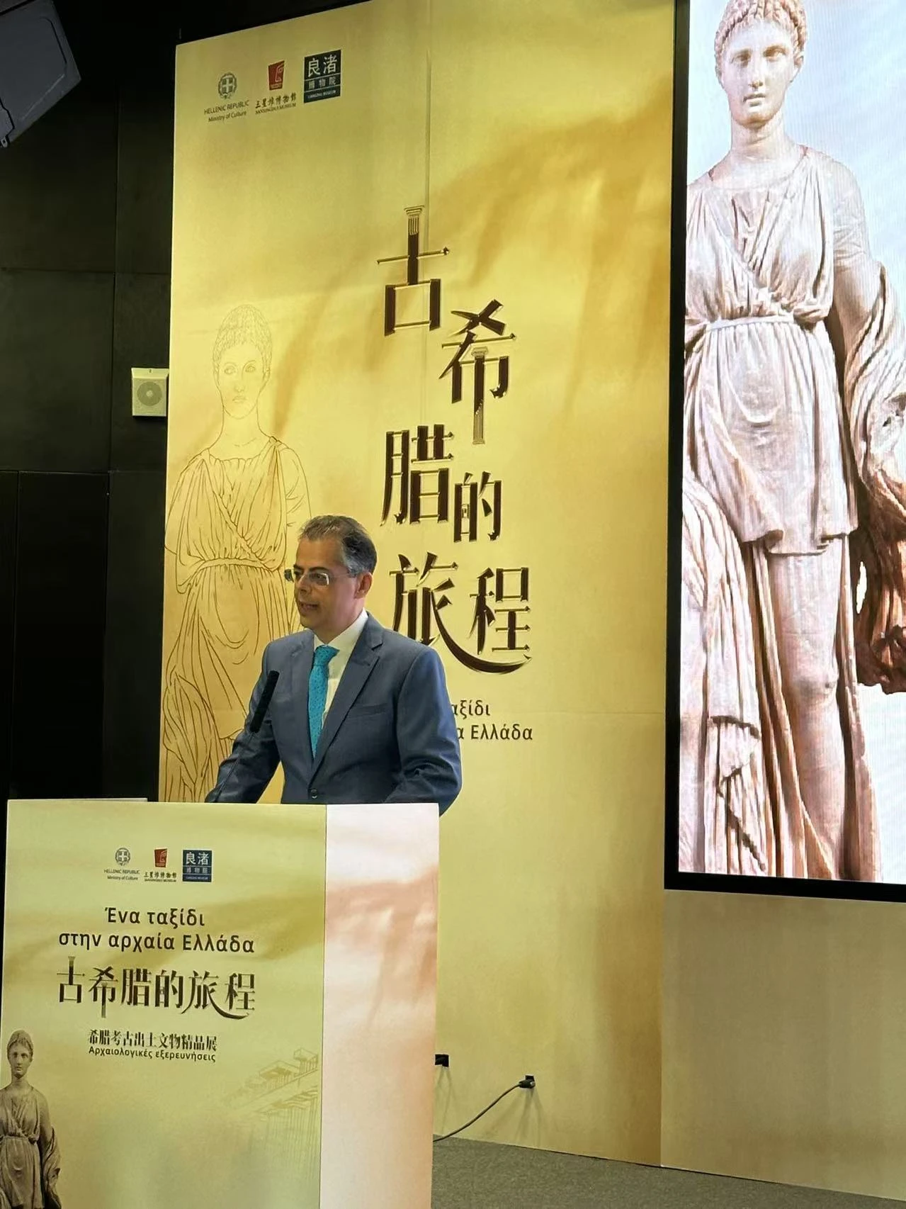 Εκ μέρους του υπουργείου Πολιτισμού, η αναπληρώτρια προϊσταμένη της Διεύθυνσης Αρχαιολογικών Μουσείων, Εκθέσεων και Εκπαιδευτικών Προγραμμάτων Νικολέττα Σαραγά ανέφερε στην ομιλία της: «Με την ευκαιρία της έκθεσης που εγκαινιάζουμε σήμερα, θα συστήσουμε όψεις του ελληνικού πολιτισμού στο κοινό της περιφέρειας Σιτσουάν, όπου αναπτύχθηκε την εποχή της δυναστείας των Σανγκ το αρχαίο βασίλειο των Σου από το 1600 έως το 1000π.Χ.».