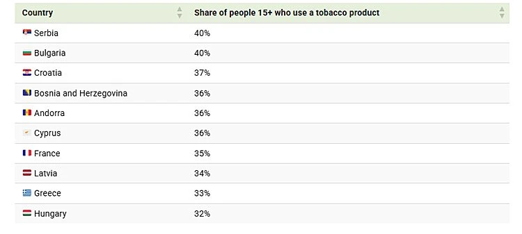 Η Βουλγαρία και η Σερβία κατατάσσονται στις χώρες με τα υψηλότερα ποσοστά καπνίσματος στην Ευρώπη, καθώς το 40% του πληθυσμού τους χρησιμοποιεί προϊόντα καπνού.