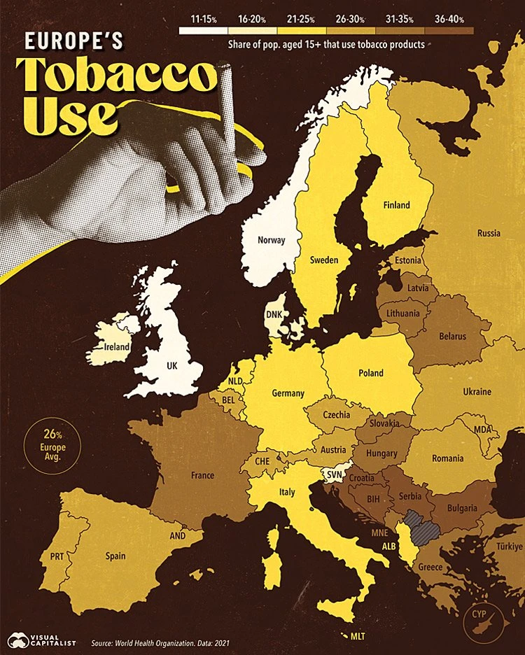 Συνολικά, στην Ευρώπη, το 26% του πληθυσμού χρησιμοποιεί προϊόντα καπνού.
