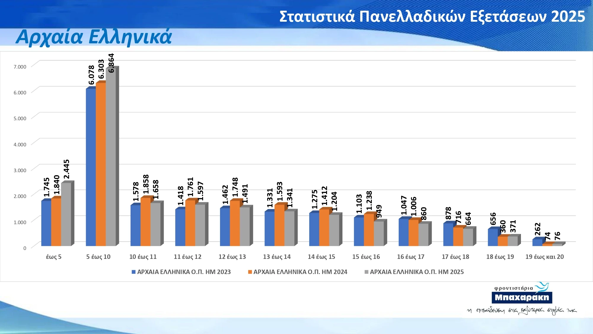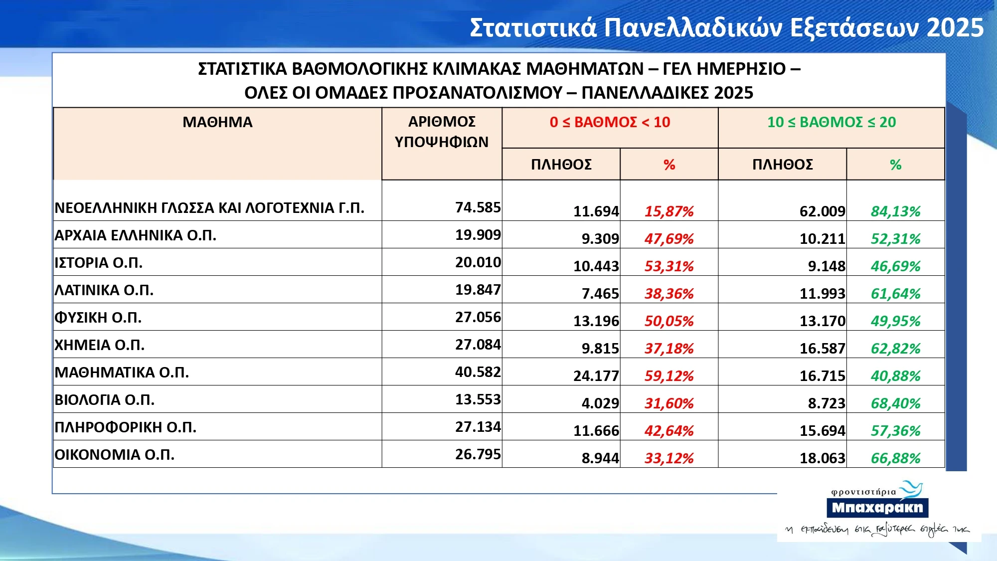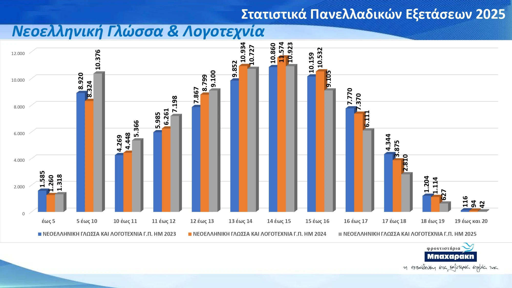 Η Νεοελληνική Γλώσσα είναι μάθημα στο οποίο δύσκολα γράφει κανείς πάνω από 18, σύμφωνα με τον κ. Μπαχαράκη. «Φέτος στις κλίμακες του 18, 17, 16 έχουμε μείωση των υψηλών επιδόσεων. Στα Αρχαία η εικόνα είναι πανομοιότυπη με πέρσι, στην Ιστορία έχουμε μία μικρή, οριακή άνοδο στις υψηλές κλίμακες και στα Λατινικά, παραδόξως (γιατί είναι ένα προβλέψιμο μάθημα) παρατηρούμε πτώση στις κλίμακες του 19, 18, 17. Άρα το πρώτο επιστημονικό πεδίο, δείχνει μία σταθεροποιητική τάση, με μικρομεταβολές. Σε καμία περίπτωση όμως δεν προκύπτει αυξητική τάση από τα στατιστικά του 1ου πεδίου», εξηγεί.