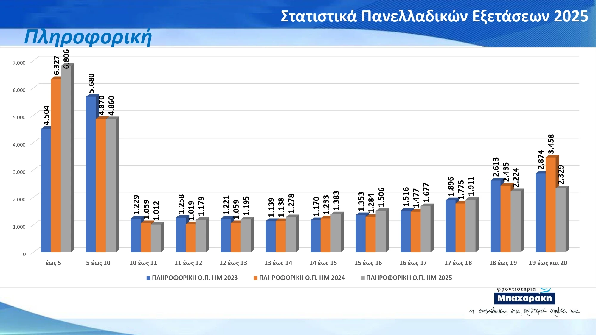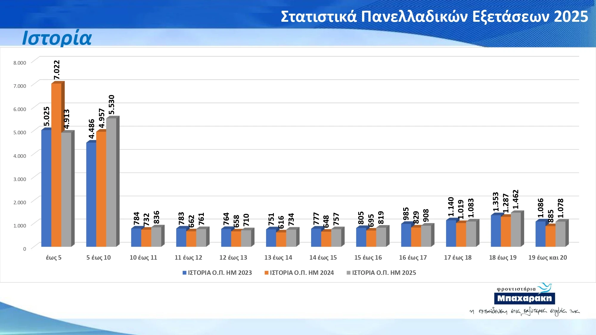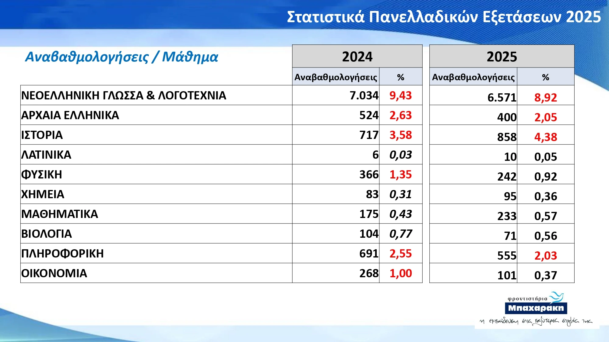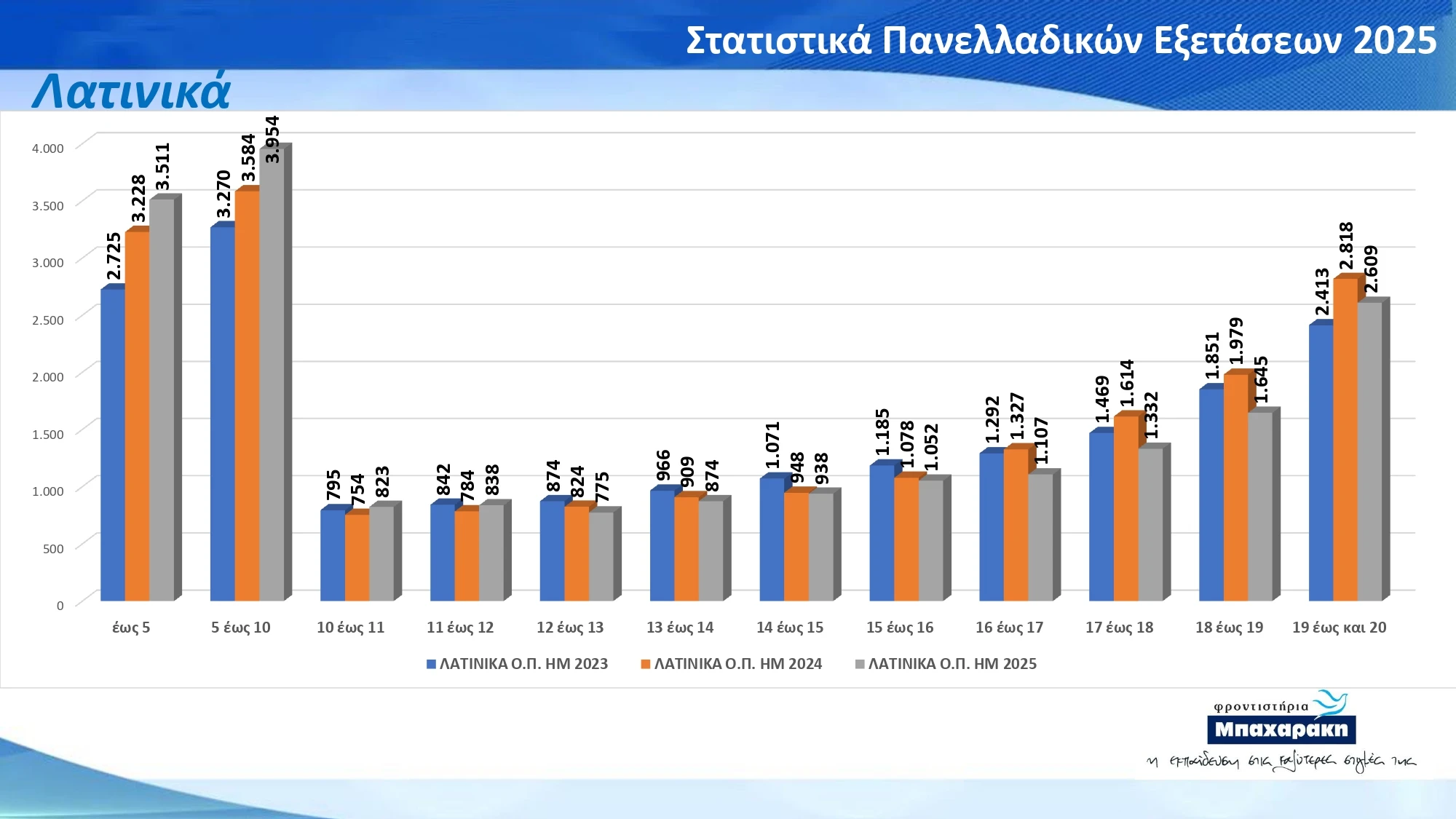 Η Νεοελληνική Γλώσσα είναι μάθημα στο οποίο δύσκολα γράφει κανείς πάνω από 18, σύμφωνα με τον κ. Μπαχαράκη. «Φέτος στις κλίμακες του 18, 17, 16 έχουμε μείωση των υψηλών επιδόσεων. Στα Αρχαία η εικόνα είναι πανομοιότυπη με πέρσι, στην Ιστορία έχουμε μία μικρή, οριακή άνοδο στις υψηλές κλίμακες και στα Λατινικά, παραδόξως (γιατί είναι ένα προβλέψιμο μάθημα) παρατηρούμε πτώση στις κλίμακες του 19, 18, 17. Άρα το πρώτο επιστημονικό πεδίο, δείχνει μία σταθεροποιητική τάση, με μικρομεταβολές. Σε καμία περίπτωση όμως δεν προκύπτει αυξητική τάση από τα στατιστικά του 1ου πεδίου», εξηγεί.
