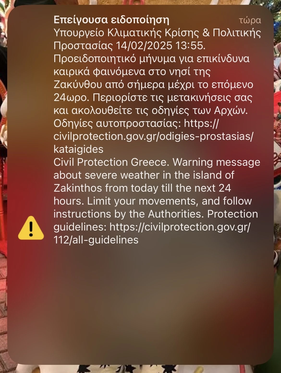 Ειδοποίηση από το 112 έλαβαν οι κάτοικοι της Ζακύνθου και της Κεφαλονιάς, πριν λίγα λεπτά για ταεπικίνδυνα καιρικά φαινόμενα που πρόκειται να πλήξουν τα δυο νησιά το επόμενο 24ωρο.