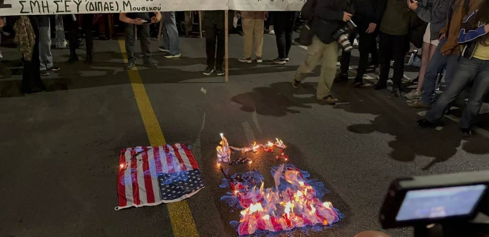 Πριν από λίγο, καθώς το πλήθος έφτασε στο ύψος του αμερικανικού προεξενίου, διαδηλωτές έβαλαν φωτιά σε σημαίες των ΗΠΑ επί του οδοστρώματος.