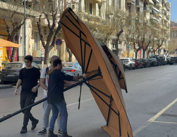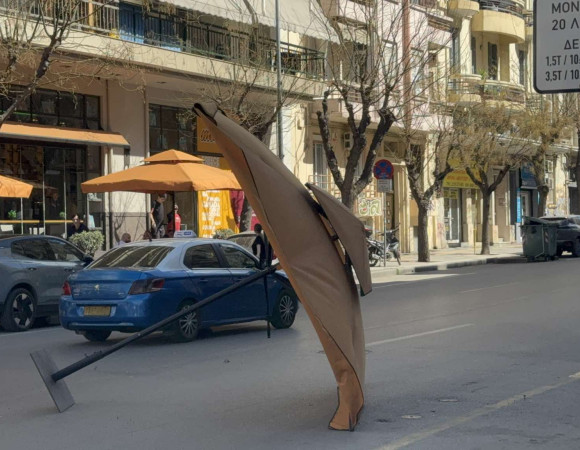 Κάτοικοι και καταστηματάρχες της περιοχής είδαν λίγο μετά τις 13:00 το μεσημέρι, μια μεγάλη πορτοκαλί ομπρέλα από καφετέρια να παρασύρεται από τον δυνατό αέρα και να καταλήγει στη μέση του δρόμου κλείνοντας την κυκλοφορία επί της Αγίου Δημητρίου.