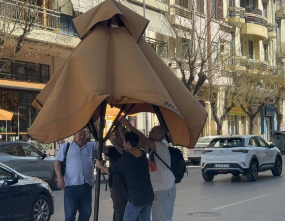 Αναστάτωση προκλήθηκε σήμερα το μεσημέρι σε έναν από τους πιο κεντρικούς δρόμους της Θεσσαλονίκης όταν ομπρέλα από κατάστημα εστίασης άρχισε να κάνει…βόλτα επι της Αγίου Δημητρίου, έχοντας παρασυρθεί από τον αέρα.