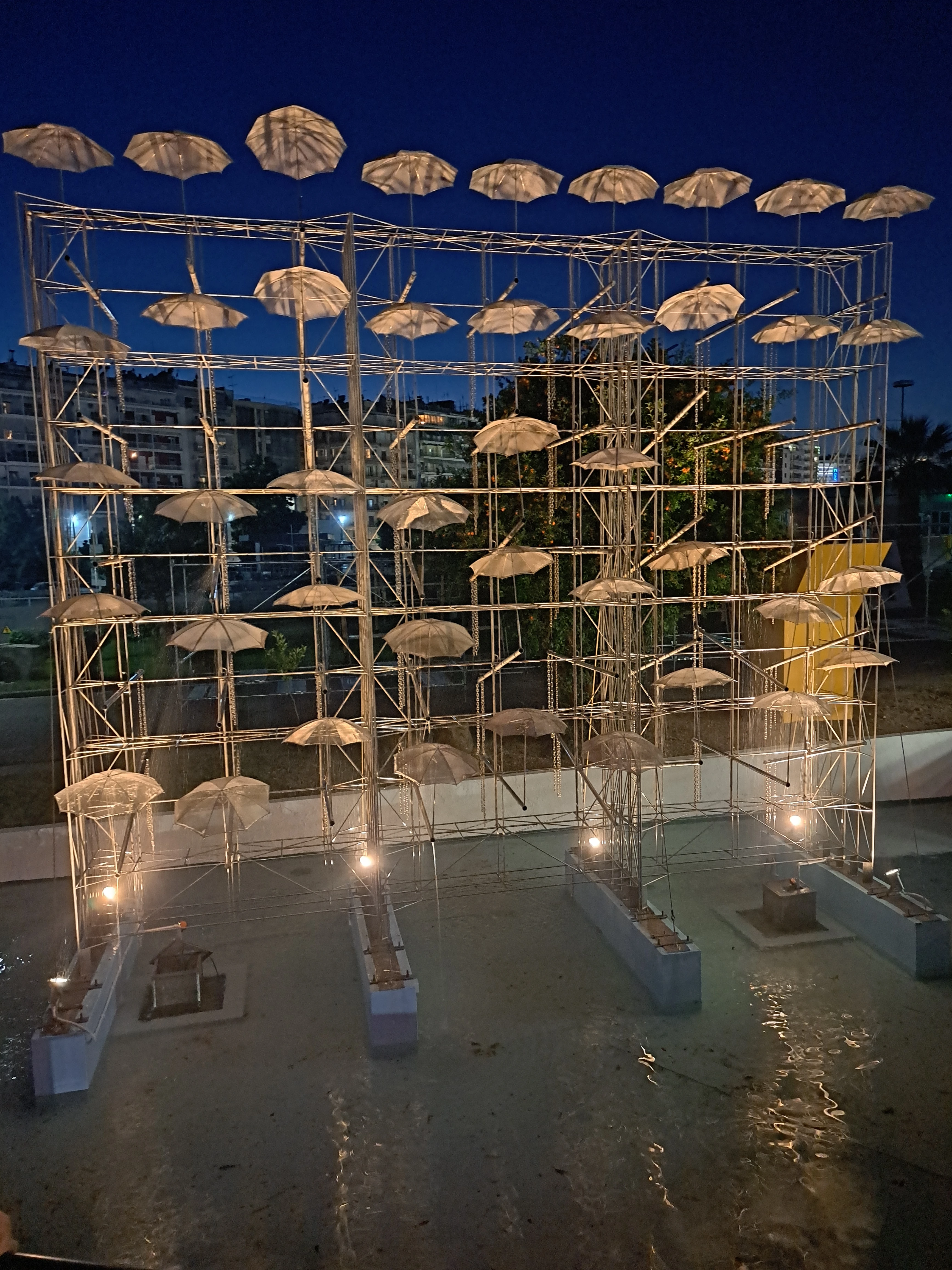 Πρόκειται για την “Υδροκίνηση στις Ομπρέλες”, έργο επίσης του Γιώργου Ζογγολόπουλου το οποίο τοποθετήθηκε το 1993. Μάλιστα παραλλαγή αυτού του υδροκίνητου γλυπτού είχε τοποθετηθεί το 1995 έξω από το Συμβούλιο Υπουργών της Ευρωπαϊκής Ένωσης στις Βρυξέλλες.