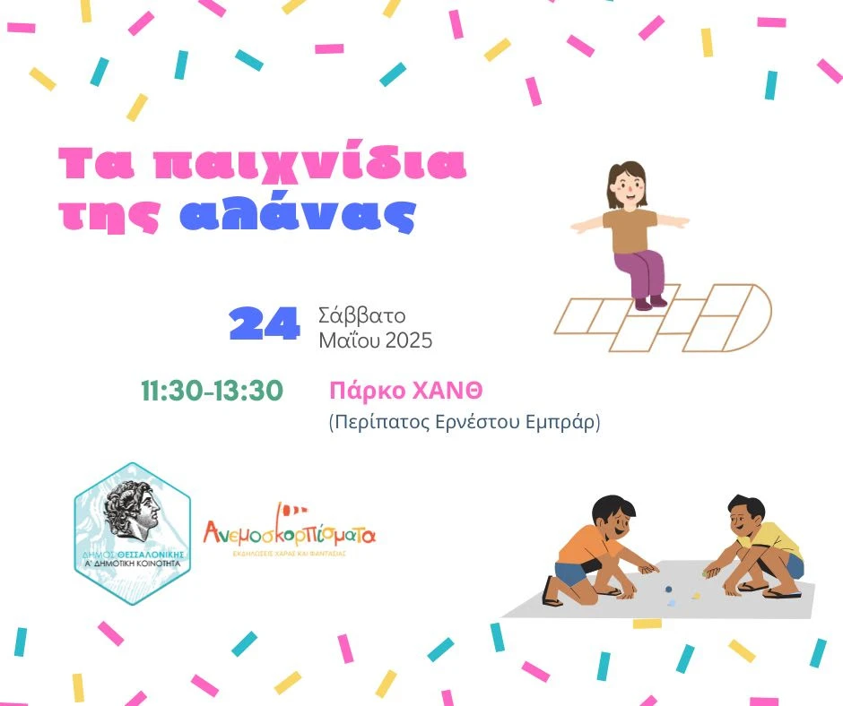 • Σάββατο 24 Μαΐου στις 11:30 «Τα παιχνίδια της αλάνας» με τα Ανεμοσκορπίσματα», που γυρνούν το χρόνο πίσω και μέσα από μια παιχνιδιάρικη περιπέτεια μετατρέπουν σε αλάνες χαράς και παιχνιδιού τον άξονα περιπάτου Ερνέστου Εμπράρ στο Πάρκο της ΧΑΝΘ!
