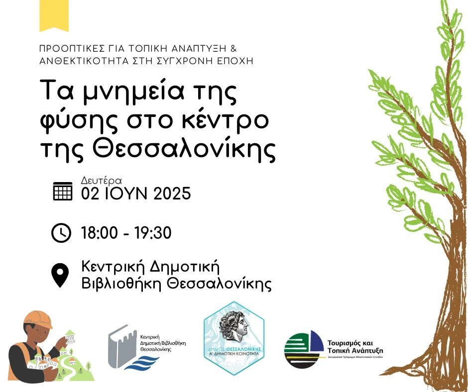 • Δευτέρα 2 Ιουνίου στις 18:00, στην Κεντρική Δημοτική Βιβλιοθήκη (Εθν. Αμύνης 27 & Αλεξ. Σβώλου), τα «Μνημεία της φύσης στο κέντρο της πόλης» θα πρωταγωνιστήσουν στην Εσπερίδα που διοργανώνεται σε συνεργασία με το ΔΠΜΣ Τουρισμός & Τοπική Ανάπτυξη του Α.Π.Θ