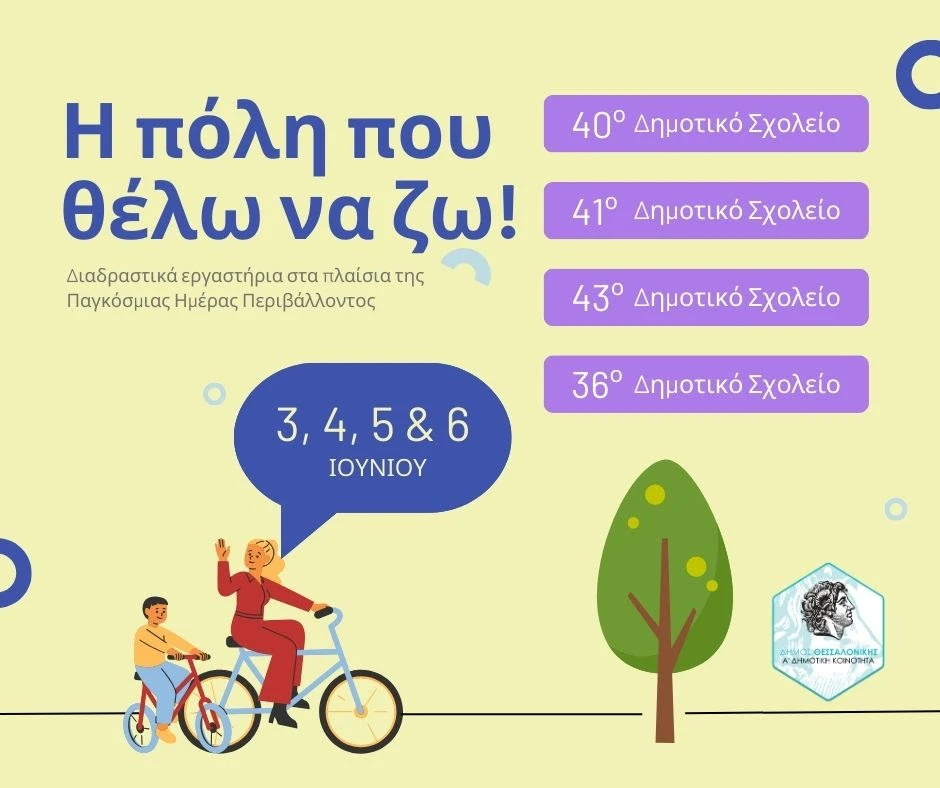 • 3, 4, 5 και 6 Ιουνίου, διαδραστικά εργαστήρια με τίτλο «Η πόλη που θέλω να ζω» στα Δημοτικά σχολεία 40o , 41ο, 43ο και 36ο , για να μάθουν οι μικροί μαθητές για τα σύγχρονα περιβαλλοντικά προβλήματα και πως αυτά αντιμετωπίζονται μέσα από το σχεδιασμό βιώσιμων, έξυπνων και ανθεκτικών πόλεων και να προτείνουν τις δικές τους λύσεις για το αστικό περιβάλλον.