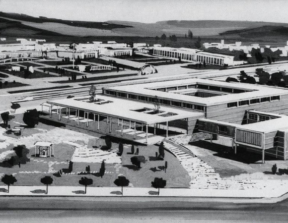 Στις εικόνες: Ο αρχικός σχεδιασμός του Πάτροκλου Καραντινού το 1960, και η αρχιτεκτονική πρόταση για τη διαμόρφωση του περιβάλλοντος χώρου του Μουσείου, όπως παρουσιάστηκε στο ΚΣΝΜ.