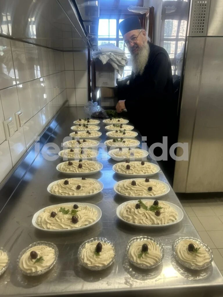 Για το μεσημεριανό τραπέζι τα φαγητά ετοιμάστηκαν με ιδιαίτερη φροντίδα και ήταν όλα νηστίσιμα λόγω της νηστείας για τη γιορτή των Αγίων Αποστόλων, καθώς στο Άγιο Όρος ακολουθείται το Παλαιό Ημερολόγιο.